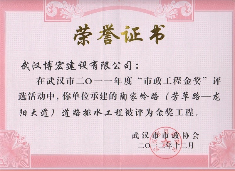 2011年度武汉市市政工程金奖(陶家岭路道路排水工程)
