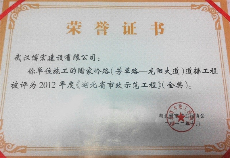 2012年度湖北省市政示范工程金奖(陶家岭路道排工程)