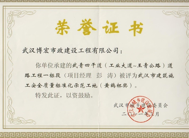 2011年度武汉市建筑施工安全质量标准化示范工地黄鹤杯奖(武青四干道道路工程一标段)
