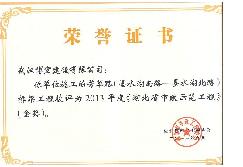 2013年度湖北省市政示范工程金奖(芳草路桥梁工程)
