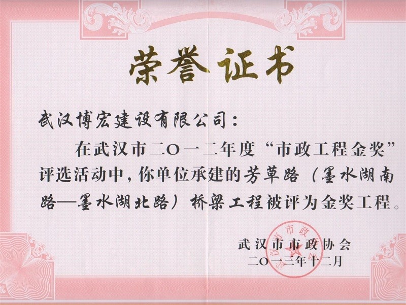 2012年度武汉市市政工程金奖(芳草路桥梁工程)