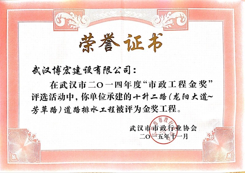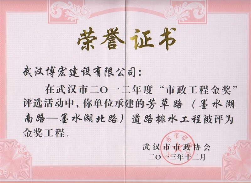 2012年度武汉市市政工程金奖(芳草路道路排水工程)