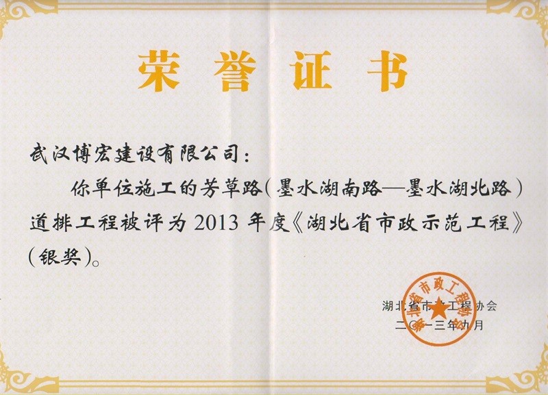 2013年度湖北省市政示范工程银奖芳草路(墨水湖南-北路道排工程)