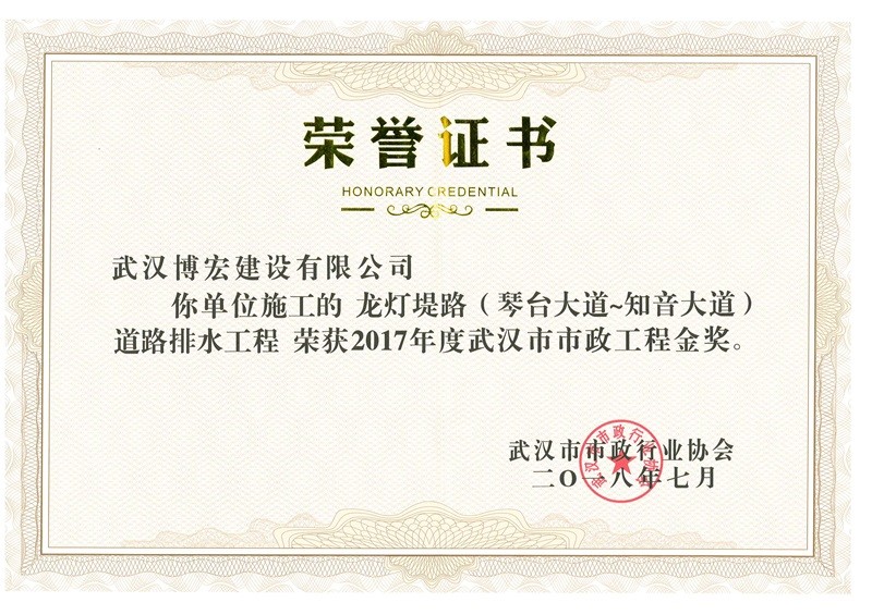 2017年度武汉市市政工程金奖(龙灯堤路(琴台大道~知音大道)道排工程)