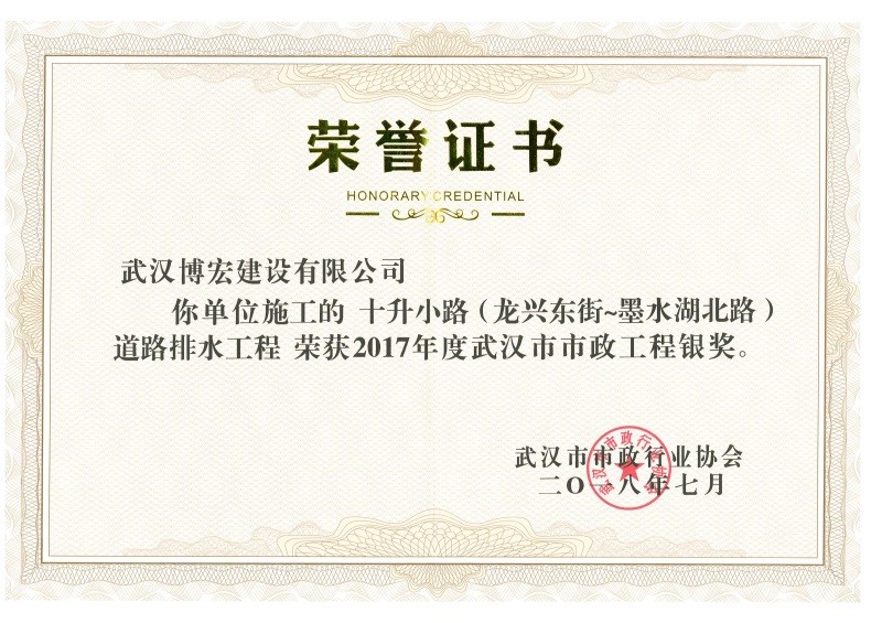 2017年度武汉市市政工程银奖(十升小路(龙兴东街~墨水湖北路)道排工程)