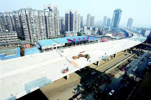 昨日,记者来到雄楚大街改造工程指挥部发现,这里异常繁忙,工人们都在忙着搭脚手架、赶进度。记者看到,雄楚大街高架梅家山立交至武汉理工大学段桥面已全线贯通,整条高架已成形。对接二环线珞狮南路高架的接线,正在紧张施工中。施工方介绍,昨日贯通的一段将于今年五一通车。据了解,二环线汉阳方面,只剩下龙阳大道墨水湖北路至知音桥段仍在施工中,其他路段均已通车。